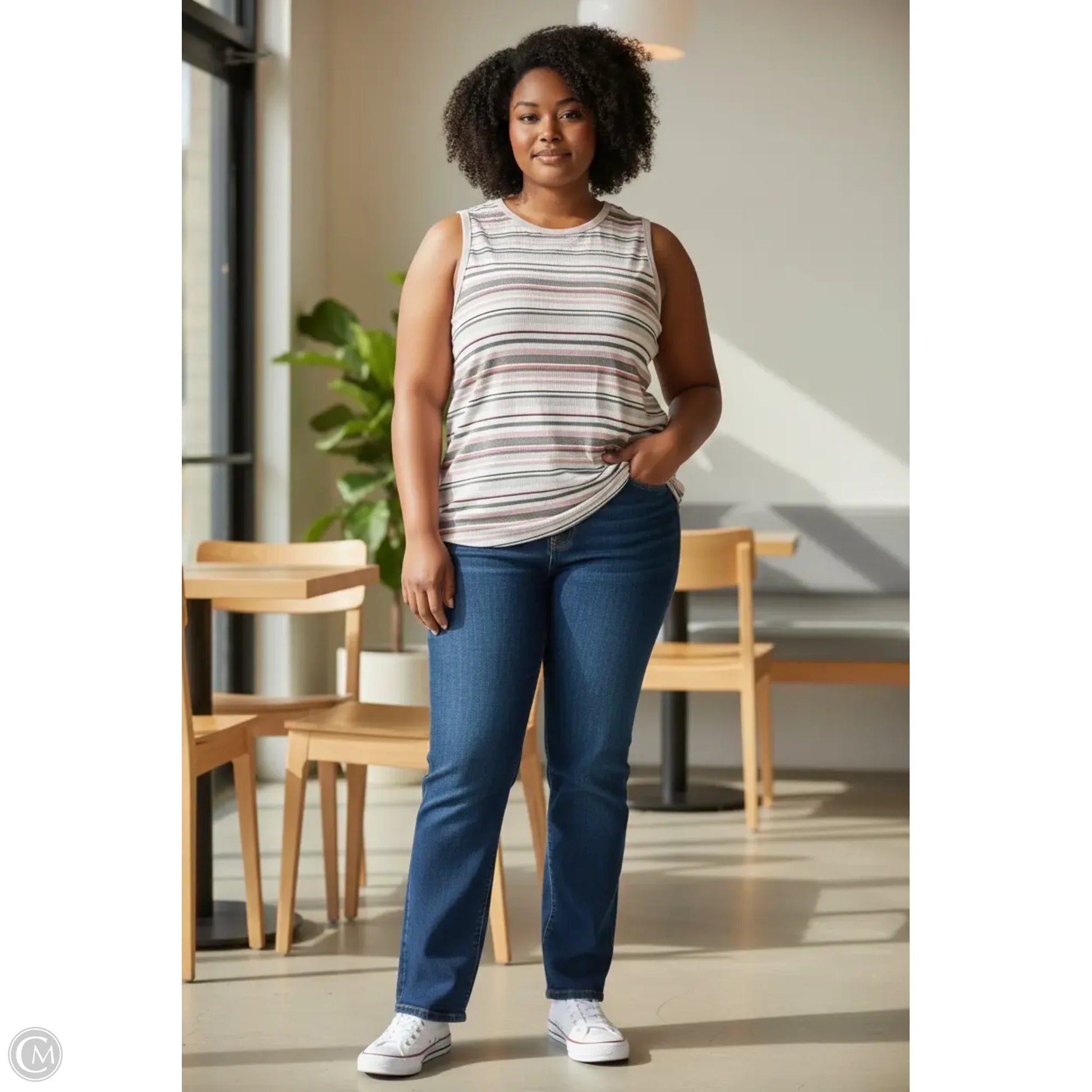 Stay cool in summer with this striped tank top by CJ Banks in size 3X. Soft fabric and flattering fit make it a must-have for effortless style. Upgrade your wardrobe with this chic essential.